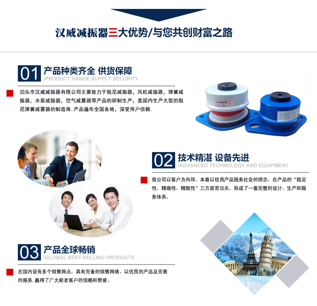 ?泊頭市漢威減振器有限公司主要致力于阻尼減振器,風(fēng)機(jī)減振器,彈簧減振器,水泵減振器,空氣減震器等產(chǎn)品的研制生產(chǎn),是國(guó)內(nèi)生產(chǎn)阻尼彈簧減震器的制造商,產(chǎn)品廣泛用于中央空調(diào)、通風(fēng)管道、鋼鐵、發(fā)電、石化、水泥和城市供熱等行業(yè)的各類管道和設(shè)備上,并在全國(guó)多地工程上得到應(yīng)用,業(yè)績(jī)遍布全國(guó)多地,深受用戶信賴. 公司主要減振器系列產(chǎn)品有:中央空調(diào)系列減振器、泵房系列減振器、管道系列減振器、風(fēng)機(jī)系列減振器、以及自行設(shè)計(jì)制作的系列隔振臺(tái)座。泊頭市漢威減震器科技有限公司擁有多名高素質(zhì)技術(shù)人員,擁有完善的阻尼彈簧減震器生產(chǎn)和檢驗(yàn)專用設(shè)備,擁有硅橡膠自動(dòng)擠出生產(chǎn)線,全自動(dòng)彈簧機(jī)等設(shè)備。生產(chǎn)條件逐漸完善進(jìn)步,努力擴(kuò)大生產(chǎn)規(guī)模,提高泊頭市減震器科技有限公司的生產(chǎn)競(jìng)爭(zhēng)力。 多年來(lái)漢威減振器以三誠(chéng)作為公司的字號(hào),旨在立足當(dāng)前......